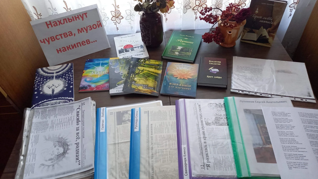 Поэзия — давняя, но вечно юная любовь человечества! Историки говорят, что первые стихи были созданы еще в II-III веке до нашей эры. С тех пор поэзия всегда с людьми. В гостях в библиотеке побывали особые люди — поэты: Рухляда Елена Арновна, Галечан Любовь Михайловна, Трухачева Анна Петровна, Лучников Сергей Анатольевич, Веретенников Роман Викторович. У кого то из них есть свои сборники, кого-то печатают в районной газете, у кого-то их поэтические строчки представлены в рукописном варианте, но все они необычные в нашем понимании люди, могут рассказать о тайном и наболевшем в рифмах, оставаясь при этом наедине с собой. Все они подарили гостям свои стихи, открыли сокровенные мысли, унесли в мир поэзии, и все эти стихи нашли благодарного слушателя. Вот так, словно ручеек текли стихи наших замечательных поэтов на разные темы , звучали строчки о любви, о природе, о патриотизме, и конечно же о маме. Слушатели с замиранием сердца ждали очередного стихотворения , задавали вопросы , делились впечатлением. Встреча завершилась чаепитием, беседой и пожеланием встретиться вновь. Вот такие замечательные люди побывали у нас в гостях. К мероприятию в библиотеке была оформлена выставка «Нахлынут чувства, музой накипев….» (автор этих строк Рухляда Е.А.)